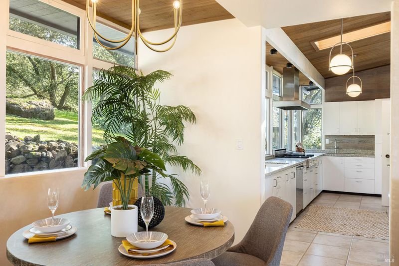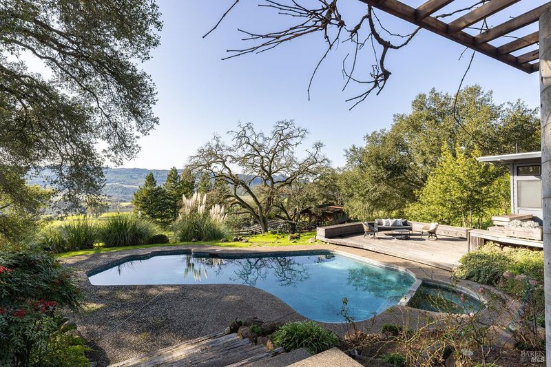 Gracefully oriented on 33 + acres in the heart of the breathtaking Bennett Valley, this mid-century contemporary gem was masterfully designed in the 60's and has recently undergone a refreshing transformation under the guidance of award-winning architect, Robert Zinkhan. The dramatic living room boasts soaring open beam ceilings, walls of glass that invite the outside in, a cozy fireplace, and elegant French glass doors that open to a picturesque terrace perfect for dining al fresco. The kitchen features state-of-the-art stainless-steel appliances, granite countertops and offers serene views of mature trees and landscaped gardens through its expansive glass walls. The family room is adorned with a whimsical round window, open beam ceiling, a large dual sided fireplace shared with the media room, and expansive sliding doors that beckon you out to enjoy the tranquil setting and pristine swimming pool. This home features four bedrooms, including two expansive primary suites. One of these luxurious primary bedrooms is perched in a separate pavilion, just a few steps from the main home. There's a stout horse barn with living quarters above which are quite charming. This secluded property, nestled at the end of a quiet country lane, offers unparalleled privacy! The majestic oak trees and sweeping valley views of distant vineyards and Jess Jackson's 1100 acre Jackson park truly awe-inspiring. Other features of the property: caretaker cottage, separate 3 car carport & separate 3 car garage. There is the possibility for an additional parcel for those who wish to create a family compound or to sell off a portion.