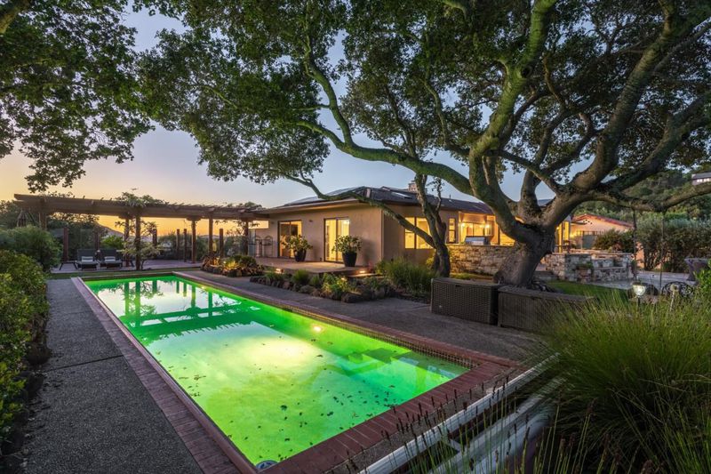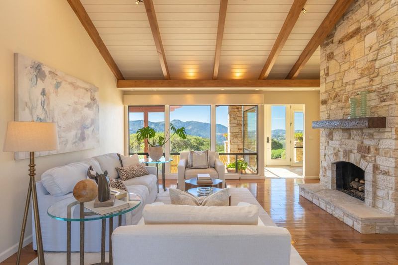 STUNNING 360 VIEWS in coveted neighborhood of Los Tulares...Private, gated Carmel Valley retreat with breathtaking sunrise and sunsets . This beautifully remodeled single-level ranch home offers 3 bedrooms and 3 bathrooms, designed for effortless indoor-outdoor living. At the heart of the home is an inviting open-concept kitchen with custom cabinetry, an oversized island, and a stunning La Cornue rangeperfect for gathering and entertaining. Natural light fills the home through skylights and open beam ceilings, complemented by warm travertine and hardwood floors. Step outside to your own resort-style setting with expansive decks, stone patios, an outdoor kitchen, fire pit, and a solar-heated pool with waterfalls. The grounds are incredibly private, surrounded by majestic oaks, lush gardens, fruit trees, and abundant wildlife. A detached studio with sweeping views offers flexible space for a home office, art studio, or guest retreat. Set on a generous lot, this property embodies the peace, privacy, and natural beauty that define Carmel Valley living.