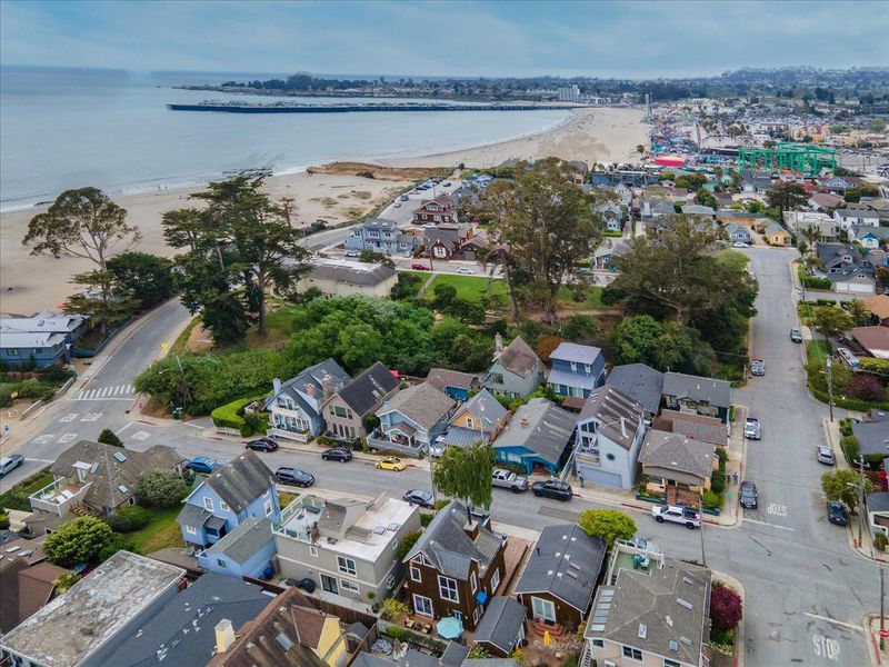 Just steps from Seabright Beach, this exceptional custom residence captures the essence of coastal luxury in one of the most iconic neighborhoods on the shoreline. With breathtaking ocean views and an atmosphere that is both serene and sophisticated, this is seaside living at its finest. Thoughtfully designed and impeccably constructed, the home spans three expansive levels and features three-zone radiant heating for year-round comfort. The main level offers two beautifully appointed bedrooms, each with sliding glass doors that open effortlessly to outdoor spaces, inviting in the ocean breeze. The lower level provides a generous family retreat complete with a full bath ideal for guests or relaxed entertaining. Above, soaring vaulted ceilings with bespoke architectural detailing create a stunning sense of volume and light. This level opens to a spacious tiled terrace, perfectly positioned to take in sweeping views of the beach and sparkling waters beyond. A rare opportunity to own a refined coastal sanctuary in an unparalleled location.