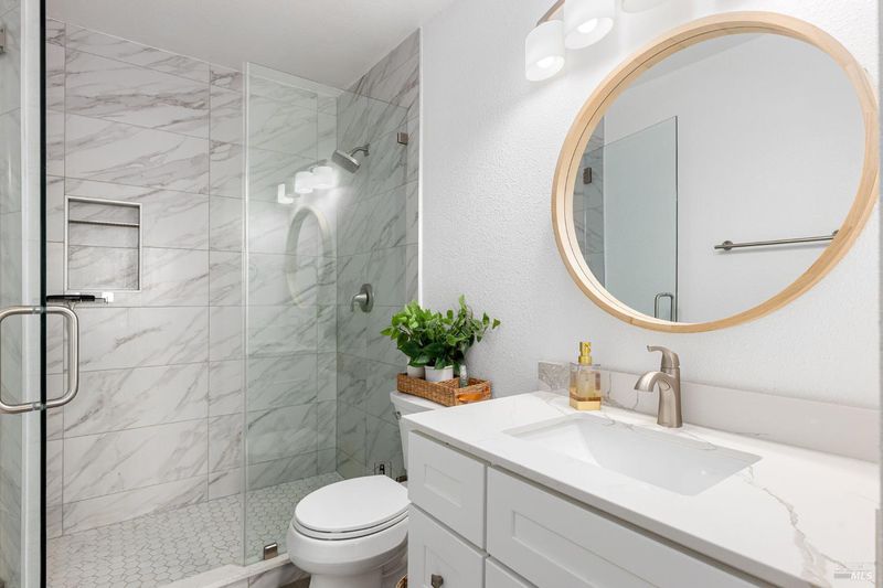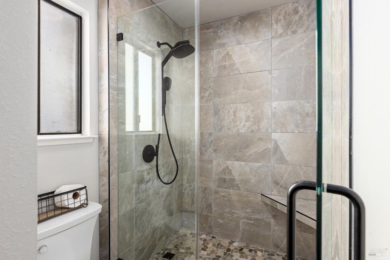- Multiple Shower Heads, Shower Stall(s), Stone, Tile, Window