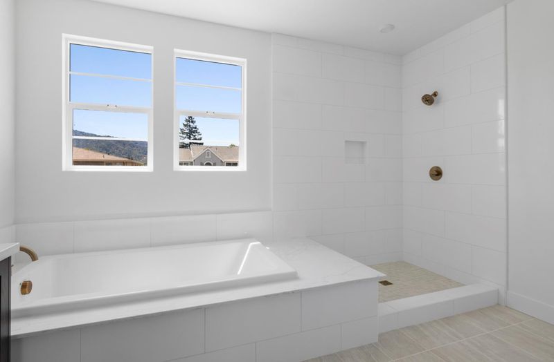 - Double Sinks, Stall Shower, Shower and Tub, Solid Surface, Tile, Full on Ground Floor, Half on Ground Floor, Primary - Stall Shower(s), Primary - Sunken Tub