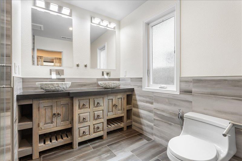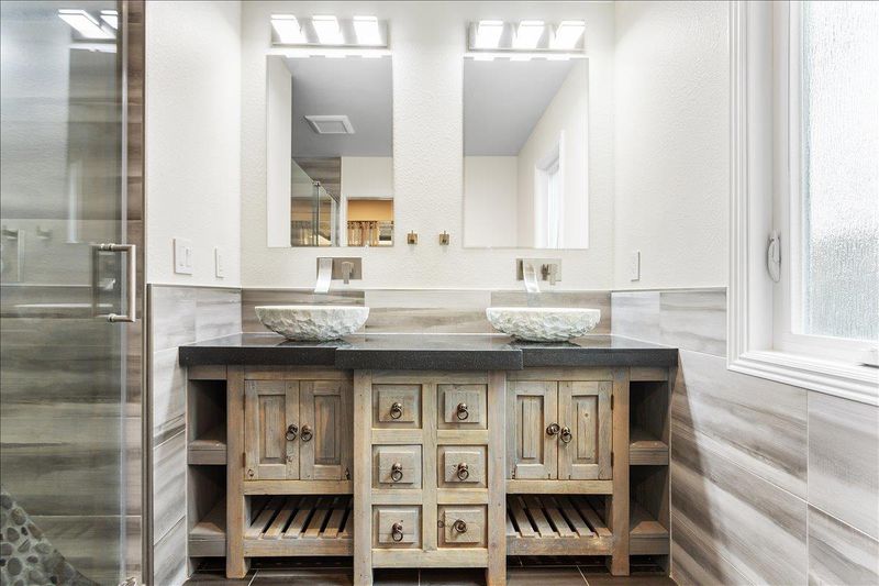 - Double Sinks, Primary - Stall Shower(s), Shower and Tub, Stone, Updated Bath