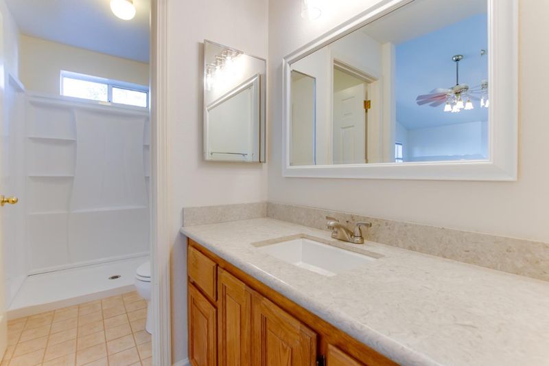 Shower over Tub - 1, Double Sinks, Solid Surface, Tile, Updated Bath, Full on Ground Floor, Primary - Stall Shower(s)