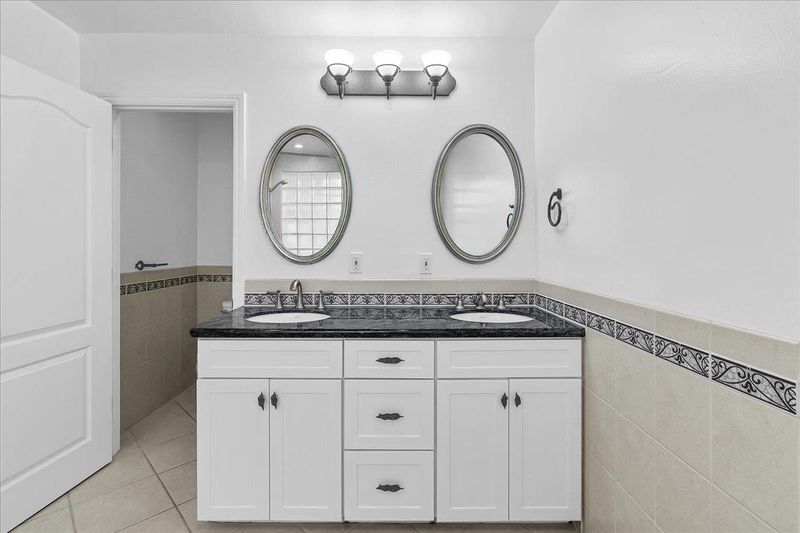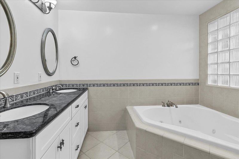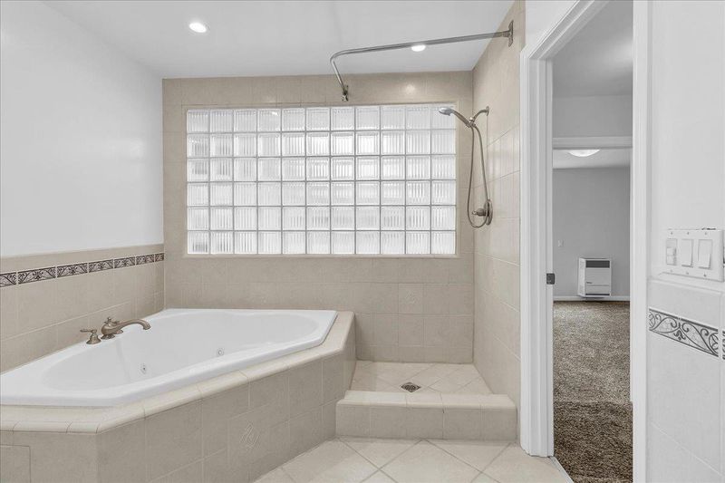 Double Sinks, Full on Ground Floor, Shower over Tub - 1, Stall Shower, Tile, Tub with Jets