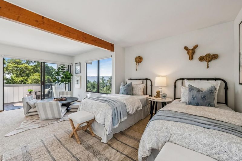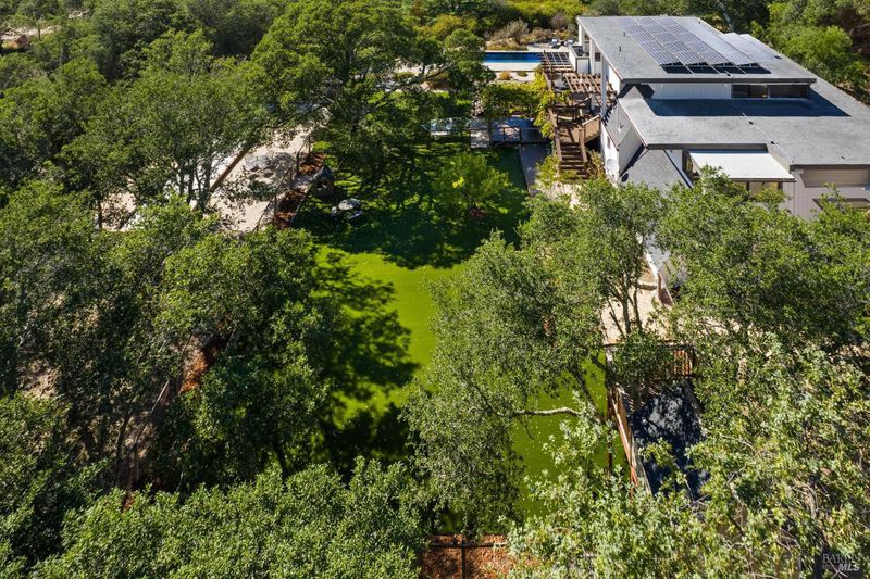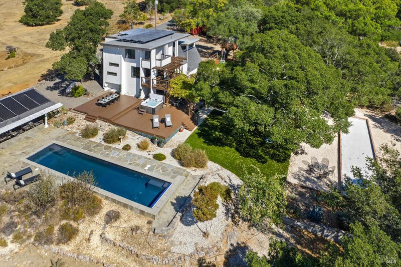 Welcome to your very own Wine Country playground where privacy abounds and up-valley vistas are among the best you'll experience. Framed by majestic oaks and redwoods on approx. 3.36 acres, this contemporary retreat delivers the Wine Country lifestyle with room to relax, gather, and play. Inside, soaring beamed ceilings and hardwood floors set a warm, airy tone. The chef's kitchen boasts granite countertops, cherrywood cabinetry, a pantry, and a sunny breakfast nook overlooking the deck. Two spacious bedroom suites provide great separationone with a walk-in closet and balcony, the other with a light-filled sunroomwhile the versatile loft suits office, fitness, or guest use. Upgrades include a fully owned smart solar system under warranty, enhancing energy efficiency. A two-car garage with extra storage and a wine cellar completes the interior. Outdoors, swim in the sparkling lap pool, unwind in the hot tub, play bocce or horseshoes, and entertain under the open-air pavilion. A broad lawn, fenced garden with fruit trees, and whimsical extrasa treehouse and zip linecreate your own private park. With valley panoramas from many windows, this is indoor-outdoor living at its best. Potential for a vacation rental permit; buyer to verify.