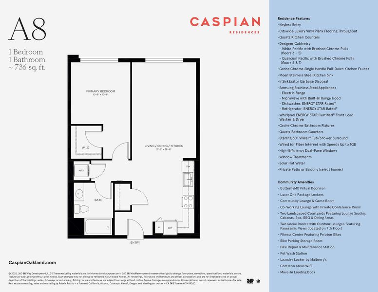 Now Selling at Caspian Residences at Brooklyn Basin - Discover modern waterside living in this thoughtfully designed 1-bedroom, 1-bathroom condo, spanning approximately 736 sq ft. Located in one of Oakland’s most exciting new communities, this home offers a rare chance to own in a vibrant, amenity-rich setting. The open layout features sleek finishes, a well-equipped kitchen with Samsung stainless steel appliances, quartz countertops, and modern cabinetry. High-efficiency dual-pane windows frame the bright living area, while the bathroom includes quartz counters and Grohe fixtures. Includes in-unit washer and dryer. Caspian residents enjoy a fitness center, a dedicated co-working space, landscaped courtyards, a game room, and rooftop lounges with panoramic views. Situated on Oakland’s revitalized waterfront at Brooklyn Basin, the community provides direct access to parks, dining, and recreation, with Jack London Square, BART, and ferry service to San Francisco just minutes away. Includes one parking space. All images are representative of the development and may be of a similar unit.