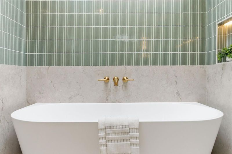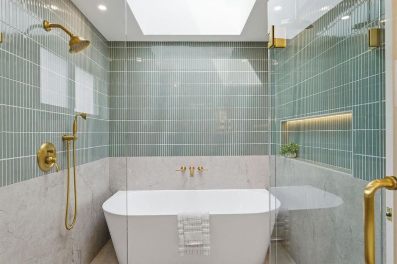 - Dual Flush Toilet, Primary - Oversized Tub, Primary - Stall Shower(s), Skylight, Stall Shower, Tile, Updated Bath
